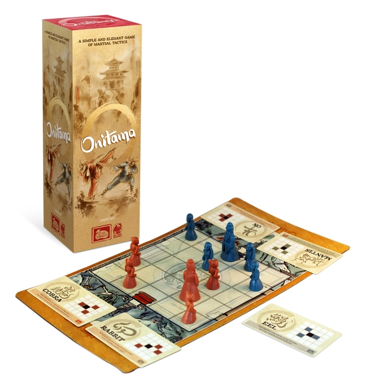 Onitama is a two-player, perfect information abstract game with a random starting set-up. On a 5x5 board, both players start with five pawns on their side, with the main pawn in the middle.