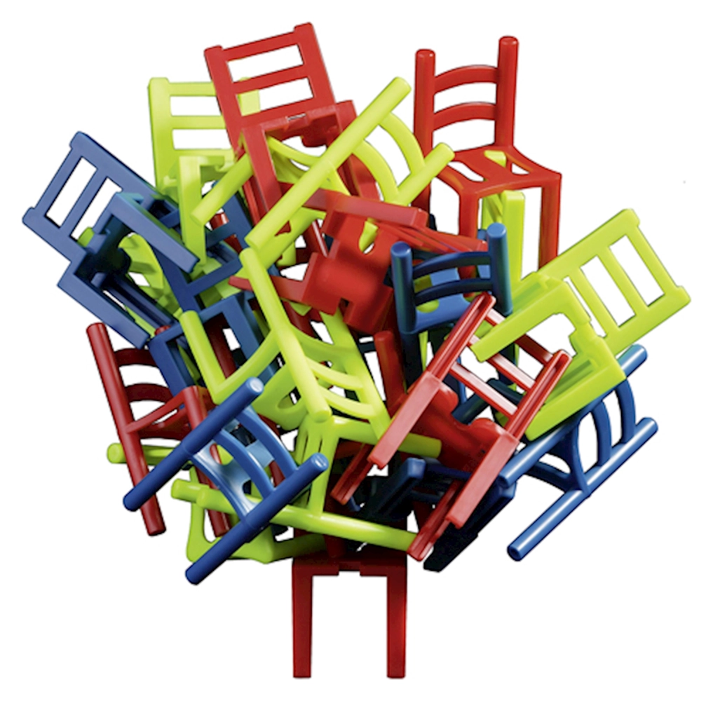 Wer schafft es seinen Stuhl zu platzieren, ohne dass der Turm umfällt? Wer hat die ruhigsten Hände und die stärksten Nerven? Denn für jeden umgefallenen Stuhl erhält man einen Strafpunkt. Der Spieler mit der geringsten Punktzahl gewinnt. Ein Spass für die ganze Familie.