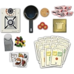 1x Herd, 1x Pfanne, 1x Gewürzstreuer, 20x Gewürze in 4x Farben, 5x Salzgerichte, 6x Kaffeetassen, 1x leckere Crêpe, 16x Menükarten, 1x Tablett für fertige Gerichte, 3x Sternekoch-Plättchen, 1x Spielregel