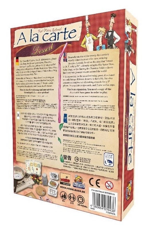 Neben allerlei Desserts enthält diese Erweiterung zu A la Carte, dem vielfach ausgezeichneten Kochspiel, das komplette Küchenset für einen 5. Spieler sowie 16 exquisite Menükarten und 2 neue Kaffeetassen. Angehende Küchenchefs finden hier neue, raffiniert-taktische Variationen, um ihrem A la Carte eine noch brillantere Geschmacksnote zu verleihen.