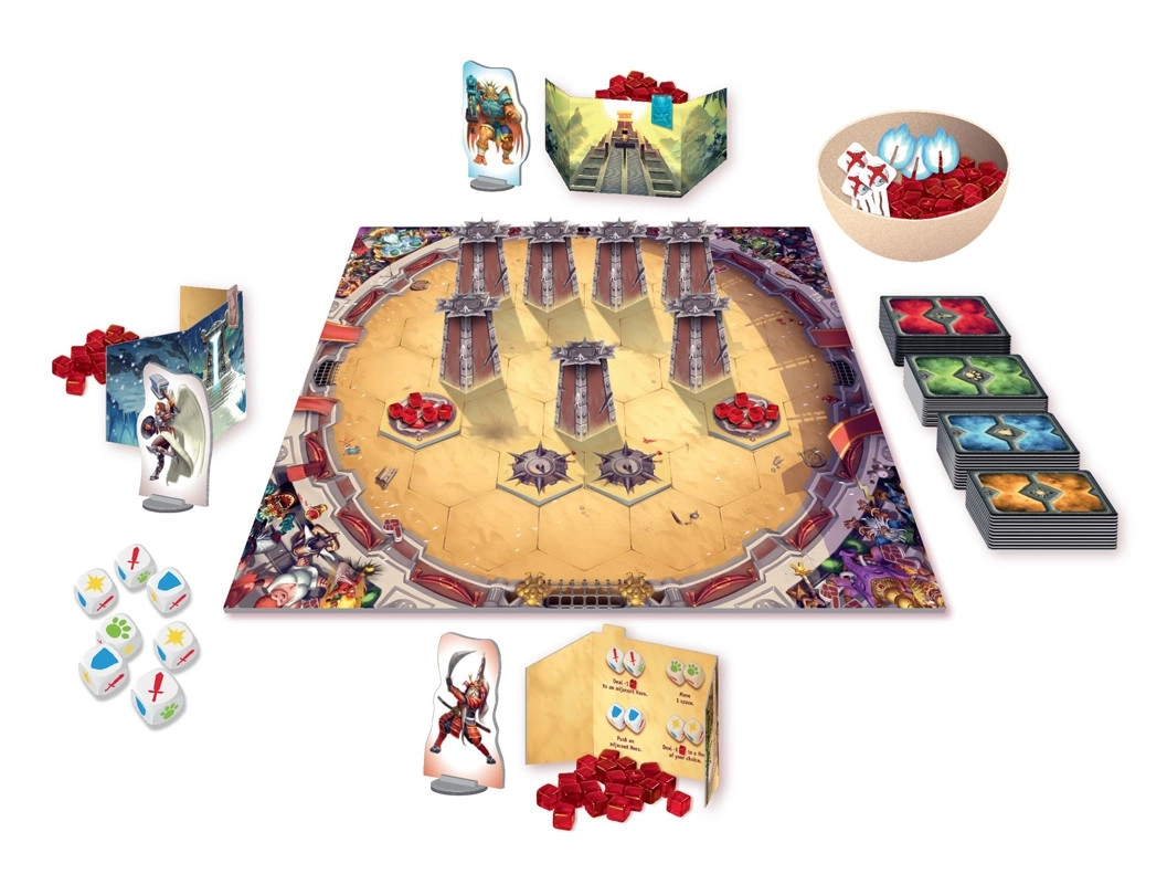 6 Figuren mit Standfüssen, 6 Sichtschirme, 1 Spielbrett, 130 Lebenspunkt-Würfel, 7 Würfel, 24 Marker, 1 Reserve, 48 Ausrüstungskarten, 7 Säulen, 7 Arena-Plättchen