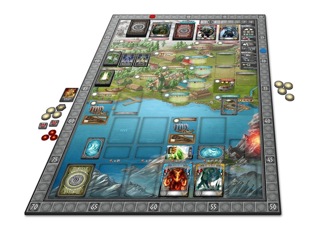 1 Spielbrett, 5 Spielertableaus der Wikingeranführer, 8 Marktstandplättchen, 20 Arbeiter, 1 kleines öffentliches Langschiff, 1 grosses öffentliches Langschiff, 4 private Langschiffe, 8 Marker in Spielerfarbe, 8 Handelsschiffkarten, 18 Reisekarten, 36 Monsterkarten, 10 Runenkarten, 12 Schicksalskarten, 16 Trollkarten, 21 Draugrkarten, 20 Holzsteine, 34 Würfel der Wikingerkrieger, 60 Münzen, 30 Nahrungssteine, 3 Schadensmarker, 54 Gunstmarker, 28 Schuldmarker, 1 Rundenmarker, 1 Startspielermarker, Anleitung