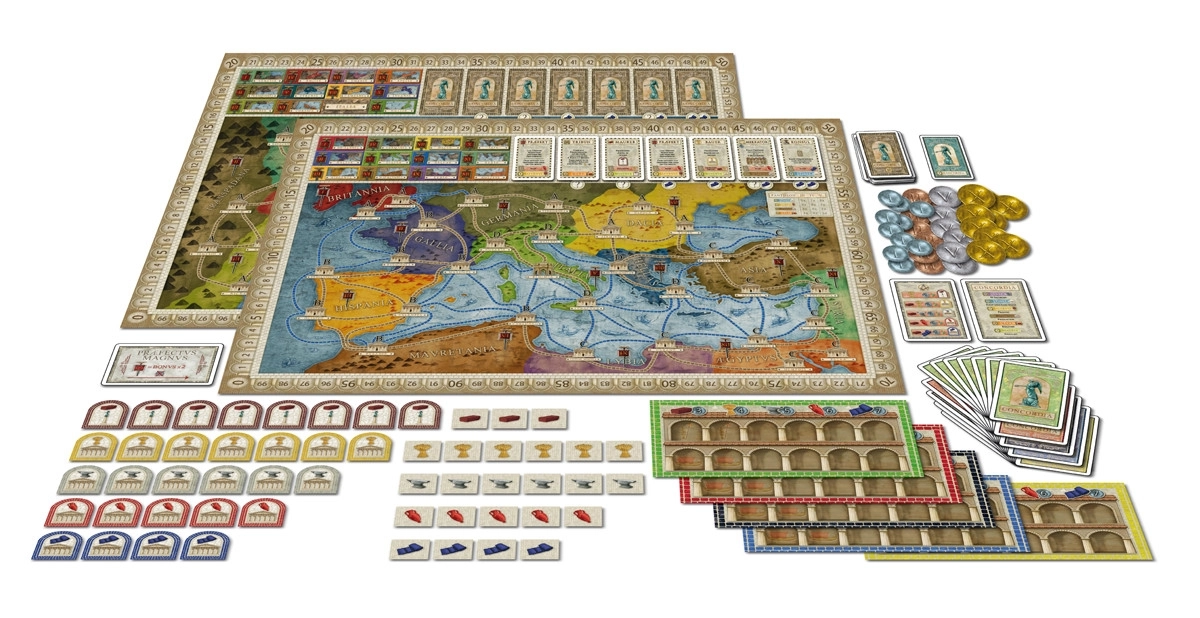 Spielplan: Imperium (3 - 5 Spieler) | Italia (2 - 4 Spieler), Spielregel (deutsch und englisch), Schnelleinstieg (deutsch und englisch), Beiheft mit Hintergrundinformationen (deutsch und englisch), 190 Holzfiguren: 75 Häuser, 15 Seekolonisten, 15 Landkolonisten, 5 Spielsteine, 80 individuell geformte Warensteine (Ziegel, Nahrung, Werkzeug, Wein und Tuch), Stanzteile: 5 Lagerhäuser, 30 Stadtplättchen, 24 Bonusmarker Münzen (1er, 2er, 5er und 10er), 72 Spielkarten (72 deutsche und 72 englische), 65 Personenkarten, 1 Concordia, 1 Praefectus, Magnus 5 Spielerhilfen