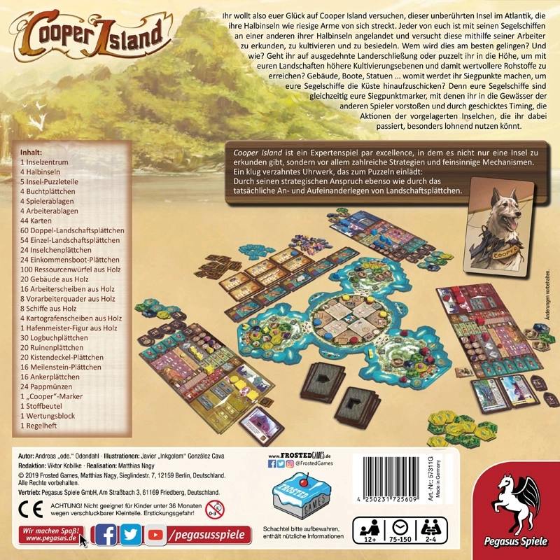 Cooper Island ist ein atmosphärisches Inselabenteuer. Den Entdeckern stehen vielfältige Optionen zur Verfügung, ihr Gebiet bestmöglich zu erforschen und zu nutzen. Ein innovativer An- bzw. Aufeinanderlege-Mechanismus von Landschaftsplättchen sowie eng verzahnte Mechanismen laden zum strategischen Planen ein.