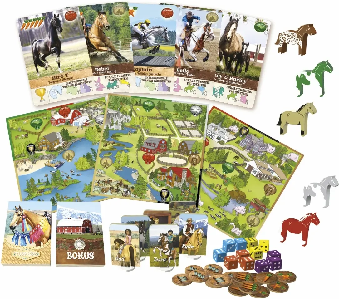 12 Spieler-Tableaus, 1 Spielplan, 6 Ranch-Tafeln, 12 Würfel, 57 Pferde, 57 Pferdekarten, 35 Bonuskarten, 16 Turnierkarten, 60 Waren-Chips, 29 Gebietsmarken, 6 Mitarbeiter, 30 Besitzmarken, 24 Upgrade-Marken, 2 Spielanleitungen