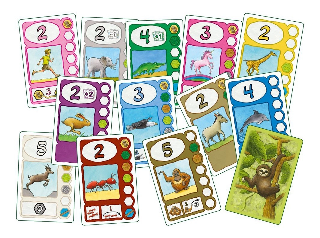 Ihr spielt immer mit 6 der 12 verschiedenen Tierarten und könnt dabei den grossen Spielplan in 4 verschiedenen Kombinationen auslegen. In euren Zügen zieht ihr 2-3 Karten von den Kartenstapeln der verschiedenen Tierarten, um dann so viele Karten wie ihr möchtet von einer Art auszuspielen. Jede Tierart bietet eine andere Art der Bewegung oder Interaktion mit euch, wie Ameisen, die euch entlang ihrer Ameisenstrassen tragen, oder Elefanten, die euch mit ihren Rüsseln werfen.