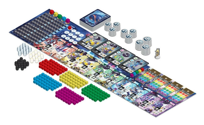 Over 300 faction-specific components for 10 different factions!, 1 Main Board, 1 Prestige Token, 30 Credit tokens, 50 Data Cards, 5 double-sided faction boards, 5 Player aids, 190+ Favor cubes, 60 Resource pieces