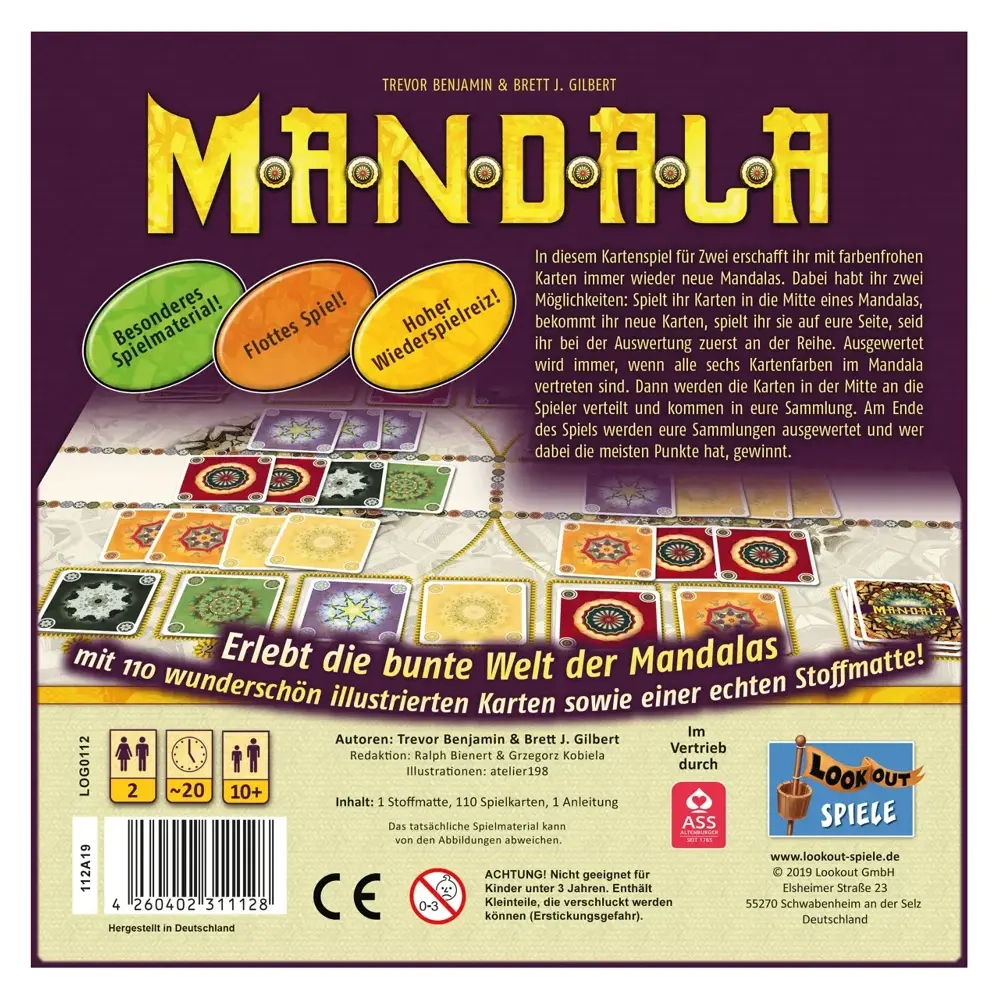 Im Zwei-Spieler-Spiel Mandala versuchen die Spieler durch das Sammeln wertvoller Karten mehr Punkte zu erzielen als ihre Gegner - aber sie wissen nicht, welche Karten wertvoll sind, bis das Spiel schon längst in vollem Gange ist. Im Laufe des Spiels spielen die Spieler ihre farbigen Karten in die beiden Mandalas, bauen die zentralen gemeinsamen Berge und legen Karten in ihre eigenen Felder.