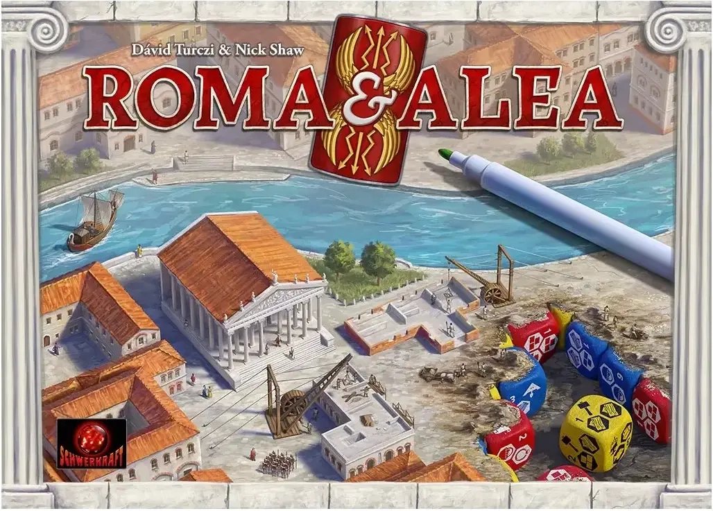 Roma & Alea ist ein "Roll & Write"-Spiel, bei dem die Spieler über die Würfel Ressourcen und/oder Aktionen bekommen, mit denen sie die Gebäude der ausliegenden Baupläne errichten. Wird ein Gebäude errichtet, zeichnet der Spieler die Umrisse des Gebäudes mit seiner Farbe auf dem Stadtplan ein.