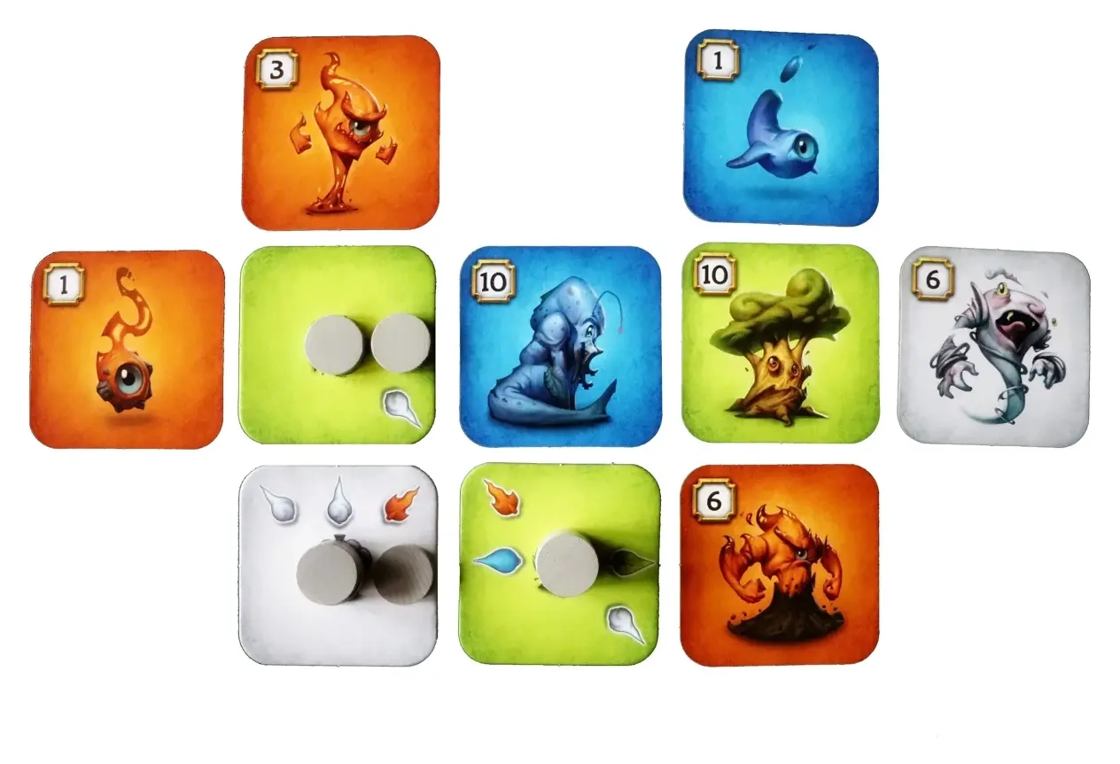 Legt die Geistplättchen geschickt an und verschiebt die Klangschalen, mit denen sich die Geister Botschaften zusenden, wenn die Harmonie der Elemente wiederhergestellt wird und lasst so ein farbenprächtiges und harmonisches Gebilde in eurer Auslage entstehen.
