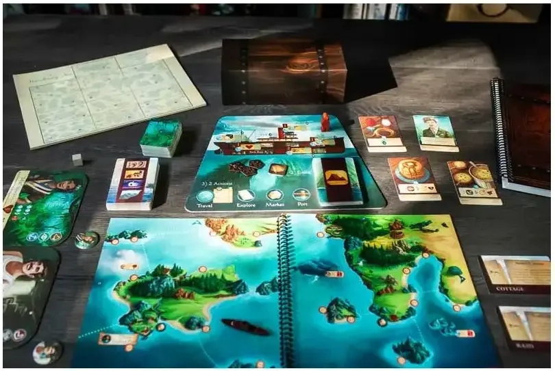 You can play solo or with friends throughout your campaign. It's easy to swap players in and out at will. Your goal is to find at least fourteen totems hidden throughout the world. Like reading a book, you'll complete this journey one or two hours at a time, discovering new lands, stories, and challenges along the way. Sleeping Gods is an atlas game. Each page of the atlas represents only a small portion of the world you can explore. When you reach the edge of a page and you want to continue in the same direction, you simply turn to a new page and sail onward.