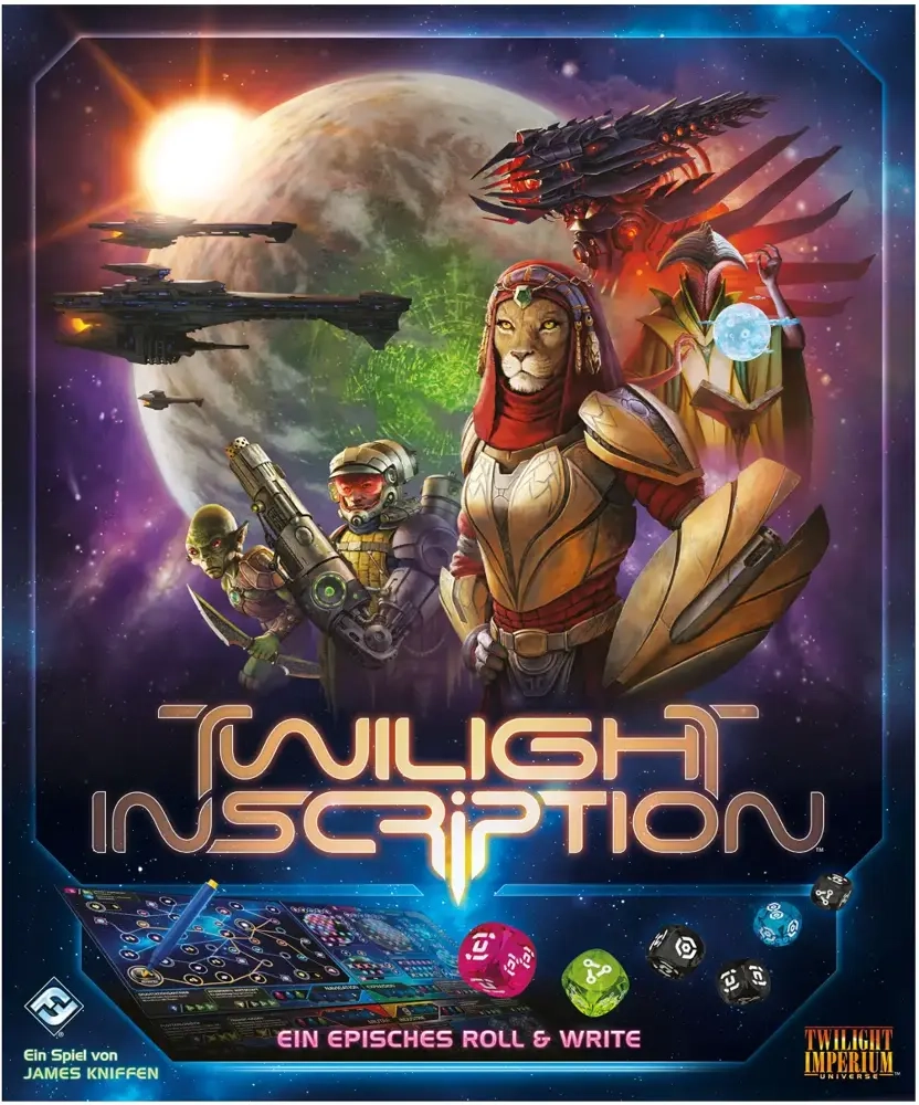 Twilight Inscription ist ein episches "Roll & Write"-Spiel im Universum von Twilight Imperium. Jeder von euch spielt eine der 24 grossen Fraktionen des Universums, die von ihrer Heimatwelt aus aufbrechen, um ihre Spuren in der Galaxie zu hinterlassen.