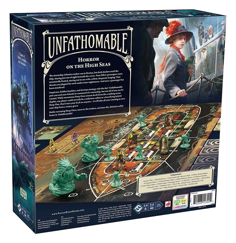 This voyage began like any other, but now it seems that the Atlantica may never reach its destination. Immerse yourself among the passengers and crew of the SS Atlantica in this game of hidden loyalties, intrigue, and paranoia for three to six players. Some players are humans who are fighting for the survival of the ship, while others are traitors sent aboard the ship by mysterious beings to ensure that it never reaches port! Because player loyalties are hidden, determining who is friend and who is foe is critical to winning a thrilling game of Unfathomable.
