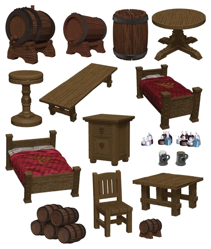Inhalt*:- 1x Single Bed,- 1x Double Bed,- 2x Nightstands,- 1x Round Table,- 1x Square Table,- 1x Long Table,- 6x Chairs,- 6x Stools,- 1x Barrel on Stand,- 1x Barrel Stack,- 2x Barrels,- 1x Six Ft Keg,- 1x Small Keg,- 1x Three Bottle Cluster,- 1x Five Bottle Cluster,- 1x Eight Bottle Cluster,- 4x Mugs,- 4x Mugs with Foam*Änderungen vorbehalten