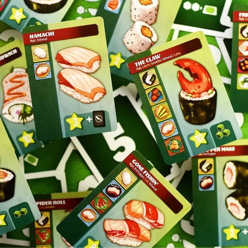 Schließe ein leckeres Rezept ab, um Punkte zu erhalten, oder nimm eine Aktionskarte, die Dir bei zukünftigen Zügen helfen. Vergiss nicht, würzigen Wasabi zu sammeln, um Aufträge mit Stil zu erfüllen! Am Ende des Abends gewinnt der Koch, der mit seinen Rezepten die meisten Punkte gesammelt hat!