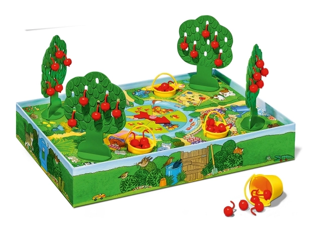 Jetzt sind die Äpfel reif und die Ernte kann beginnen. Doch aufgepasst, man darf sich nicht vom frechen Raben oder dem leckeren Eis ablenken lassen! Das Brettspiel fördert spielerisch das erste Regelverständnis, die Wahrnehmung und erstes Zählen.