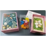 Inhalt: 55 Spielkarten, 5 Holzhasen, 2 Holzhühner, 1 Holzscheibe