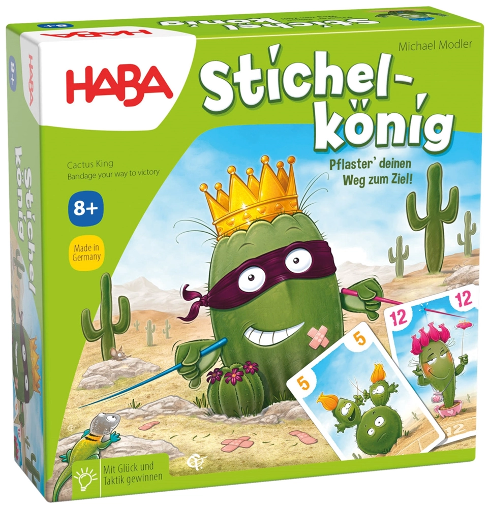 Bei dem lustigen Kartenspiel Stichelkönig versammeln sich die Spieler:innen um Kaktus-King Miguel de la Espina, drehen seine Stacheln und versuchen, ihre Karten klug auszuspielen und ordentlich Pflaster abzusahnen.