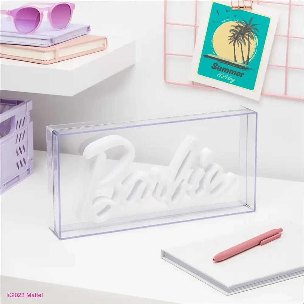 Diese freistehende LED-Lampe ist 15 cm hoch. Schalten Sie sie ein, um das Barbie-Logo von Weiß in ein leuchtendes Pink zu verwandeln. Sie wird Ihrer Wohnung einen lustigen Farbtupfer verleihen.
