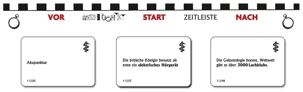 Bei Anno Domini müssen Ereignisse in die richtige zeitliche Abfolge gebracht werden. Es kommt dabei jedoch nicht auf exaktes Wissen an. Denn wer weiss schon, ob es das erste weiche Toilettenpapier zu kaufen gab bevor oder nachdem das Lachgas entdeckt wurde.