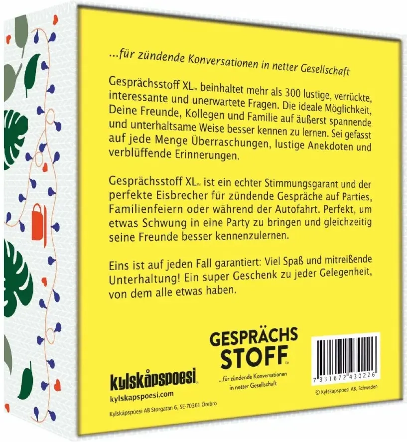 Gesprächsstoff ist ein echter Stimmungsgarant und der perfekte Eisbrecher für zündende Gespräche auf Parties, Familienfeiern oder während der Autofahrt. Perfekt, um etwas Schwung in eine Party zu bringen und gleichzeitig seine Freunde besser kennenzulernen. Eins ist auf jeden Fall garantiert: Viel Spaß und mitreißende Unterhaltung! Ein super Geschenk zu jeder Gelegenheit, von dem alle etwas haben.