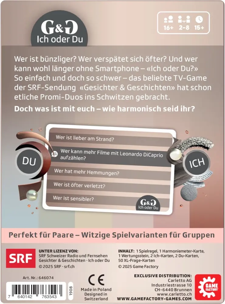 Wer ist bünzliger? Wer verspätet sich öfter? Und wer kann wohl länger ohne Smartphone – «Ich oder Du?» So einfach und doch so schwer – das beliebte TV-Game der SRF-Sendung «Gesichter und Geschichten» hat schon etliche Promi-Duos ins Schwitzen gebracht. Doch was ist mit euch – wie harmonisch seid ihr?