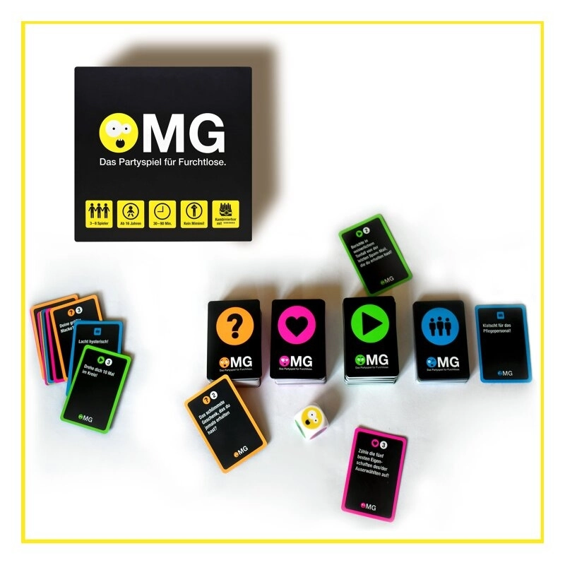 OMG ist ein ganz normales Partyspiel – aber viel besser! Per Würfelwurf besiegeln die Spieler ihr Schicksal: Je nach Wurf, «dürfen» sie eine Frage beantworten, eine Aktion ausführen, einem Mitspieler einen Gefallen tun oder eine Gruppenaufgabe erfüllen. Die Spieler können sich von jeder Aufgabe freikaufen – indem sie die auf der Aufgabenkarte definierte Anzahl Schlucke trinken. Je unangenehmer die Aufgabe, umso höher der Preis.