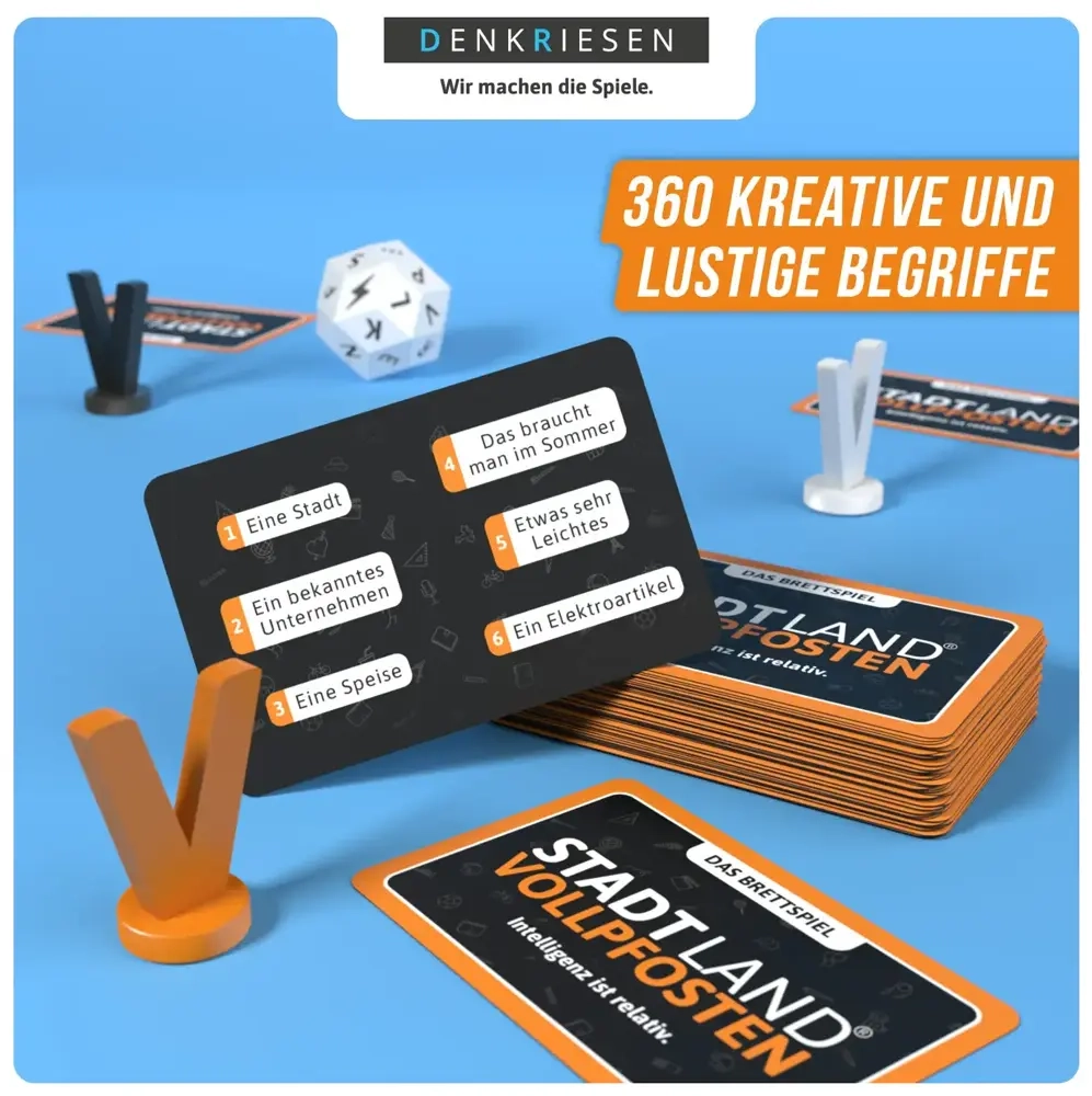 Entdeckt jetzt das offizielle Brettspiel von STADT-LAND-VOLLPFOSTEN. 360 kreative und lustige Kategorien bringen jeden Hobbydenker ins Schwitzen. In diesem Spiel tretet ihr in Teams gegeneinander an und müsst gemeinsam möglichst viele richtige Begriffe zu den verschiedenen Kategorien finden.