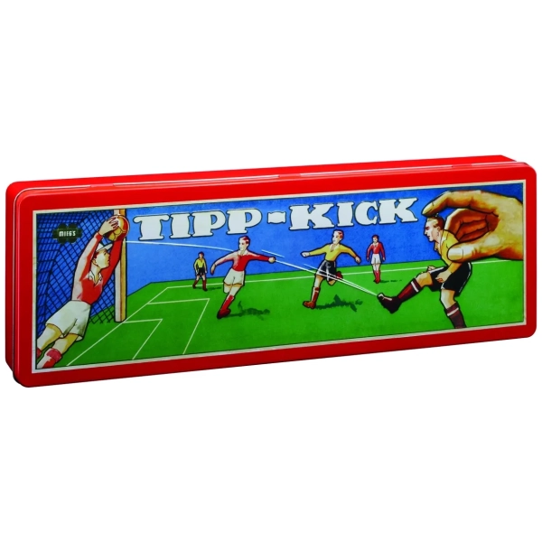 Diese TIPP-KICK Edition ist ein ganz besonderes Spiel geworden. Der Inhalt orientiert sich an den historischen Vorbildern aus den 50er Jahren. Das Filzspielfeld ist mit Holzleisten versehen, die Tore sind aus Messing und die Bemalung der Spielfiguren erinnert an die Vorbilder der 50er Jahren. Ganz besonders ist die Verpackung: das Spiel wird in einer hochwertigen Blechschachtel ausgeliefert Inhalt: 1 Spielfeld aus Filz mit Holzleisten 80 x 47cm, 2 Tore aus Messing, 1 Metallkicker rot, 1 Metallkicker gelb, 1 Torwart *Toni* rot, 1 Torwart *Toni* gelb, 2 rot/gelbe TIPP-KICK Bälle, Spielanleitung.