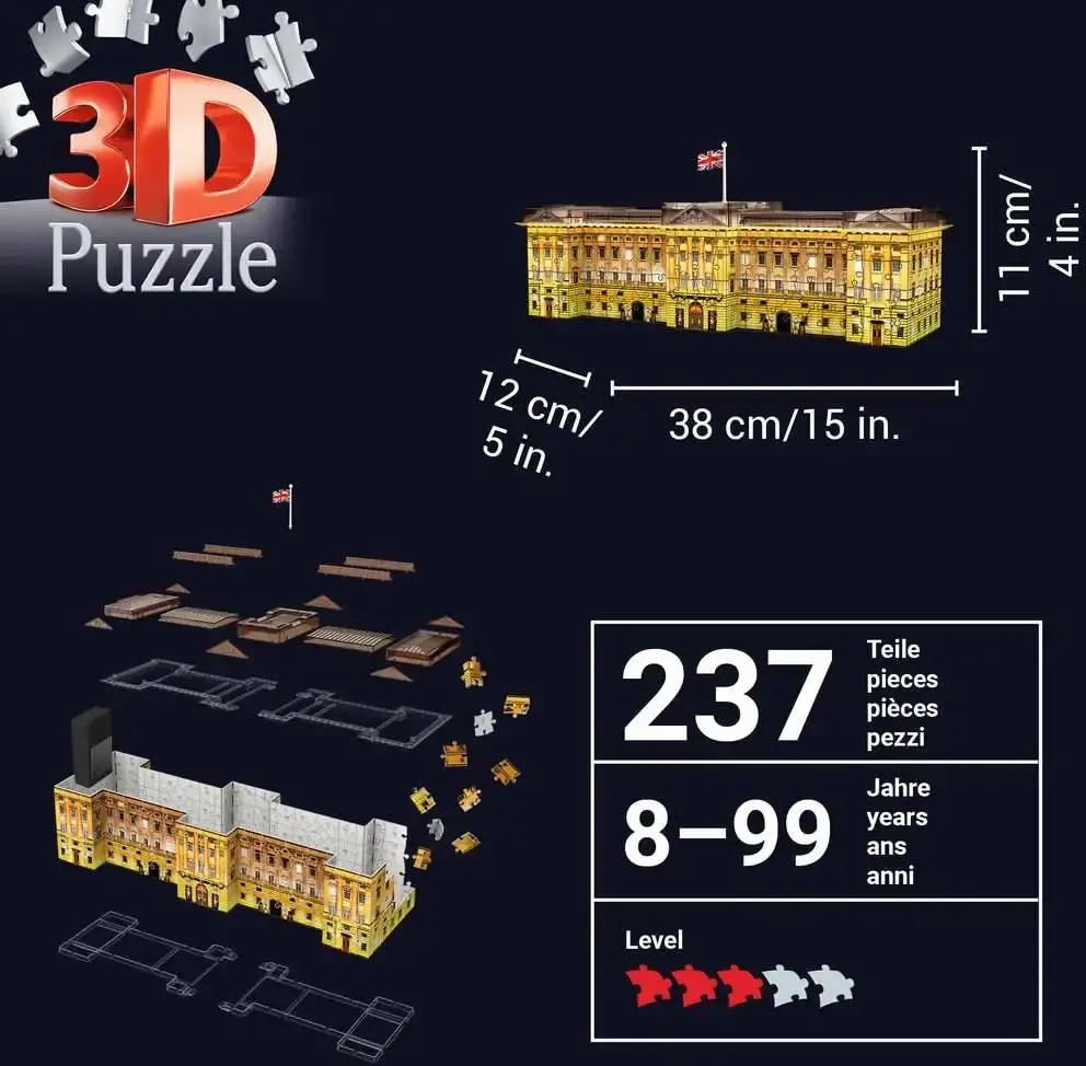 Erleben Sie Puzzeln in der 3. Dimension. Der Buckingham Palast aus London als einzigartiges 3D Puzzle mit Beleuchtung! Die Kunststoff-Puzzleteile passen perfekt zusammen und formen ein stabiles 3D Puzzle. Die LED-Leuchten lassen das Bauwerk wahlweise in Weiss oder in Farbe erstrahlen.