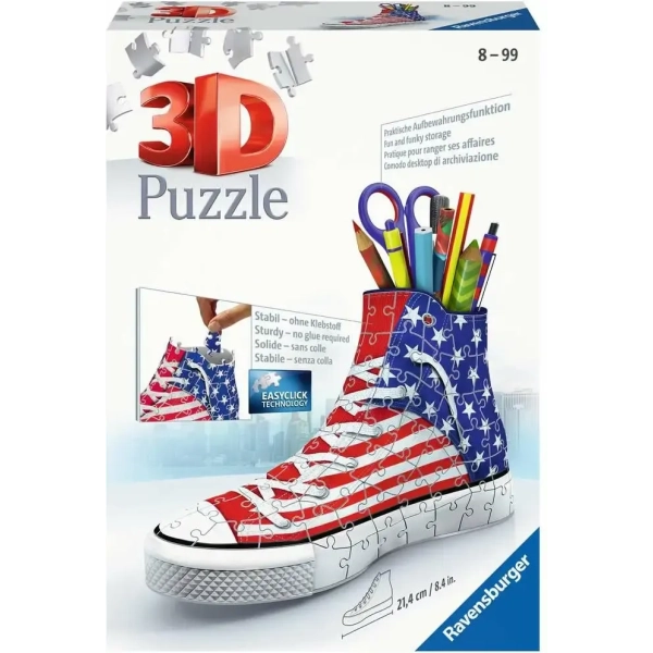 Die Sneaker-Serie sorgt für Ordnung im Kinderzimmer. Aus einzelnen Teilchen wird ein stylisher 3D-Schuh gebaut. Dieser bietet Platz für Bleistifte, Kugelschreiber oder gar eine Schere. Auf dem Schuh ist die USA-Flagge zu sehen.