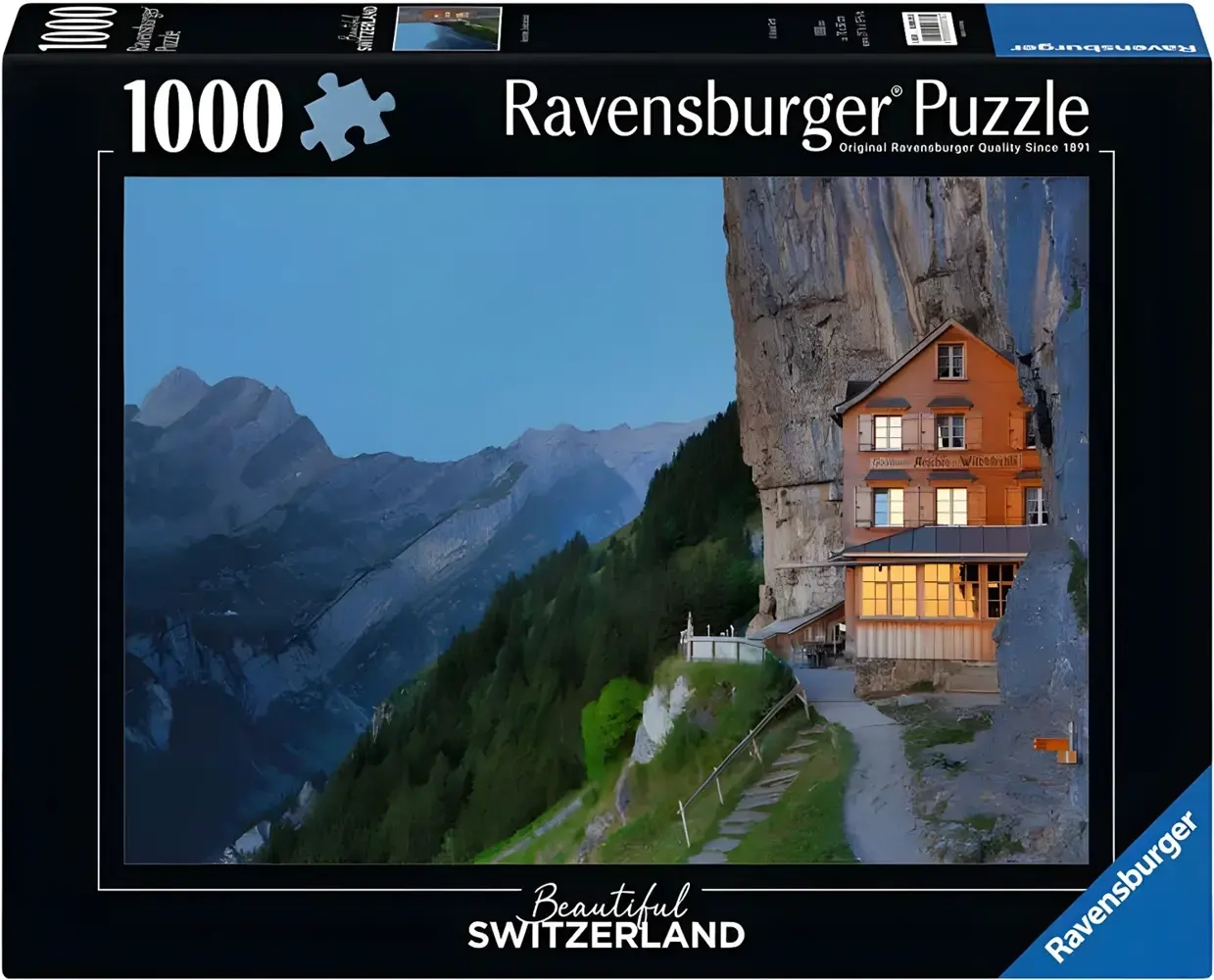 Das «Äescher Wildkirchli» ist ein Puzzle von Ravensburger und enthält 1000 Teile. Es zeigt das Schweizer Berggasthaus des Jahres 2012, welches bei Wanderern besonders angesagt ist. Selbstverständlich kommen Sie auch in den Genuss von gewaltigen Schweizer Bergen mit viel Grün.