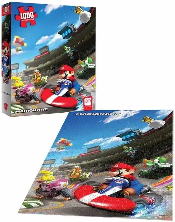 Steer clear of mismatched pieces to gain momentum in this 1,000-piece Super Mario Kart jigsaw puzzle capturing your favorite Mushroom Kingdom racers in a mad dash to the finish line.