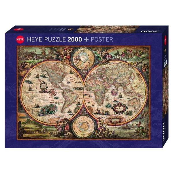 Hinter der klassischen, im antiken Stil gehaltenen Weltkartengestaltung - geteilt in Ost und West, Nord und Süd – versteckt sich die aktuelle Ländereinteilung der Erde. Gelegte Grösse: 96.6x68.6 cm.