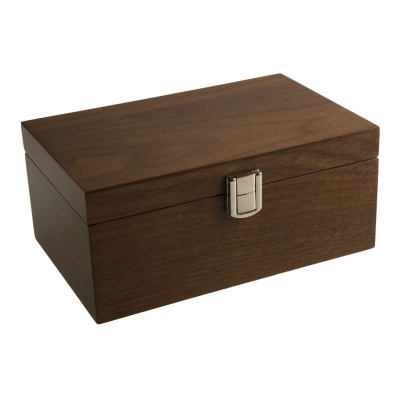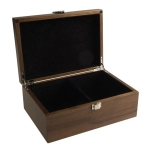 Eine Figurenbox komplettiert ein Schachspiel und schützt die Figuren. Das Nussbaumdesign mit silberfarbenen Verschluss, die Auskleidung aus schwarzem Stoff sind praktisch.