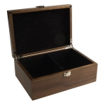 - Figurenbox Nussbaum: Edle Box aus Nussbaumfurnier, innen mit schwarzem Stoff ausgestaltet und in zwei Fächer unterteilt. Aussenmasse 24 x 17 x 9.5 cm