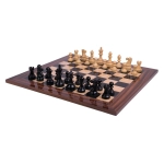 Die Schachfiguren entsprechen den offiziellen Turnieranforderungen des Schweizerischen Schachbundes. Die massige Turm, der ballonförmige Läuferkopf, der Sphärenkopf des Bauern, der kraftvolle Springer sowie das edle Königskreuz und die elegante Damekrone: Die Figuren bilden eine unverwechselbare Crew. Alle Figuren sind gewichtet und dadurch auch in hitzigen Spielsituationen standfest. Buchsbaum mit einer Dichte von bis zu 1.1 Gramm pro cm3 und Palisander mit 1.15 pro cm3 sind vorzügliche Drechslerhölzer. Die Filzunterlage ermöglicht ein angenehmes Ziehen und Platzieren ohne das Brett zu zerkratzen. Die Stauntenform ist dank ihrer gut unterscheidbaren eleganten Form weltweit die weitverbreitetste Turnierschachfigur.