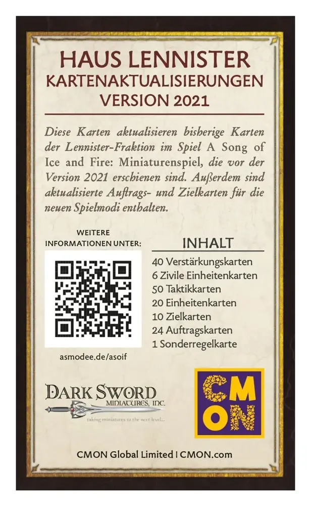 Die Haus Lennister Kartenaktualisierungen für das Tabletop-Spiel A Song of Ice & Fire aktualisieren bisherige Karten der Lennister-Fraktion, die vor der Version 2021 erschienen sind. Ausserdem sind aktualisierte Auftrags- und Zielkarten für die neuen Spielmodi enthalten.