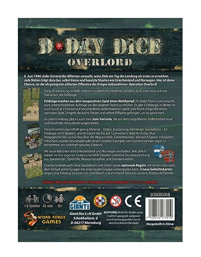 Die Erweiterung "Overlord" enthält: Kampagnenregeln, Alternative Gefechtskarten für GOLD Beach (1 Bunker), Juno Beach II, Marker, 2 zusätzliche Spielersets (je ein RWB-Würfelset, Spezialistenset, Ressourcenkartenset, Standortwürfel für Griechenland und Norwegen), neue Orden, Ausrüstung, Fahrzeuge, 4 exklusive Orden, 4 Legendäre Einheiten.