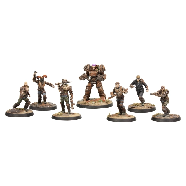 This boxed set contains seven 32mm scale multi-part high quality resin Raider miniatures, each with unique scenic bases, to allow players to expand their Fallout: Wasteland Warfare games.