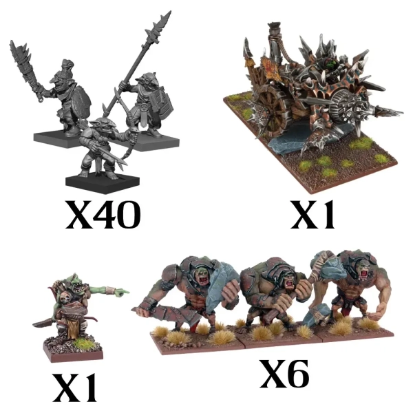 Contains: 40 hard plastic Goblin infantry (build Spitters, Rabble or Sharpsticks) 8 hard plastic Mawpups 1 PVC plastic Goblin Mincer 1 metal Goblin Biggit 6 PVC plastic Trolls Models supplied unpainted and unassembled. Resin and PVC models require super glue, and Plastic framed miniatures require plastic glue.