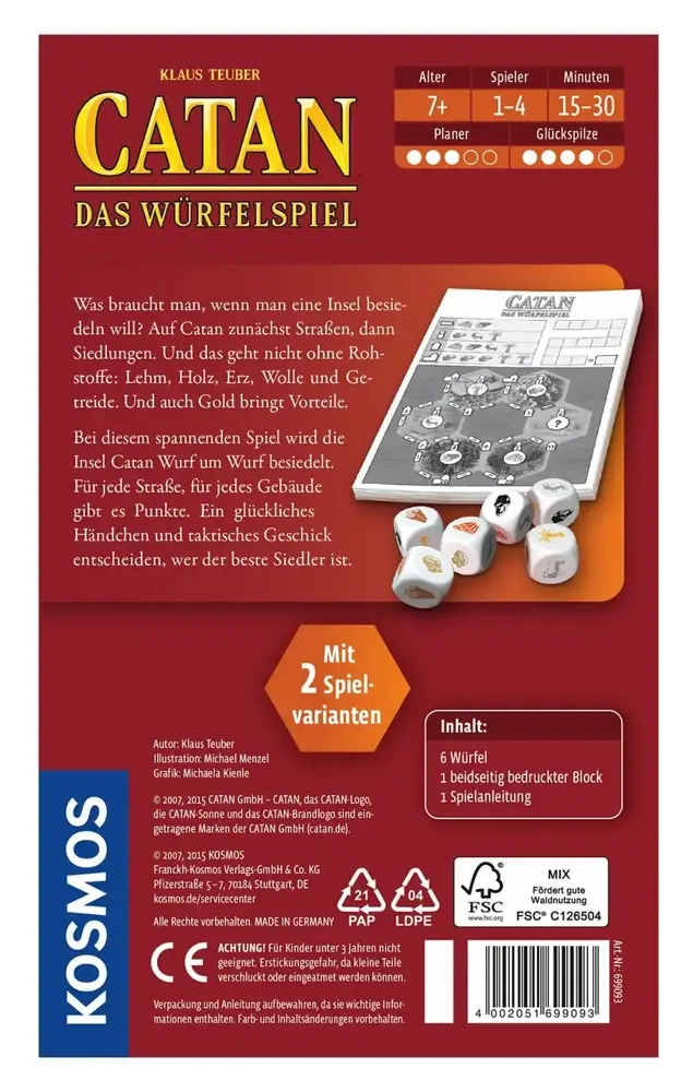 Was braucht man, wenn man eine Insel besiedeln will? Auf Catan zunächst Strassen, dann Siedlungen. Und das geht nicht ohne Rohstoffe: Lehm und Holz, Erz und Wolle. Getreide braucht man zum Essen – und wer viel Glück hat, findet Gold. Bei diesem lockeren Würfelspiel wird die Insel Catan Wurf um Wurf besiedelt. Für jede Strasse, für jedes Gebäude gibt es Punkte. Ein glückliches Händchen und taktisches Geschick entscheiden, wer der beste Siedler ist. Hier kann jedem der grosse Wurf gelingen!
