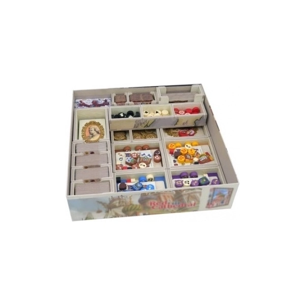 When packing the box, first place the personal boards on top of the lower layer of trays. Next place the rule book on top of the personal boards, sealing the contents of the trays underneath. Note that there is room for just one langauge version of the rulebook. Lastly place the main game board on top. This fully fills the box without any lid lift and allows for vertical storage of the game. FS-LACRI is an officially licensed insert product made in partnership with Devir Games. All trademarks and copyrights remain the property of their respective owners, which are in no way associated or affiliated with Folded Space EOOD.