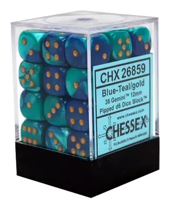Gemini 12mm d6 Dice Blocks with pips Dice Blocks (36 Dice) - Blue-Teal w/gold