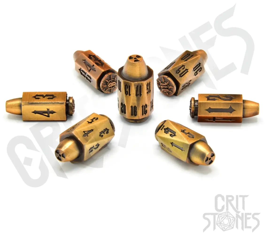 A metal bullet-shaped dice set with an antique brass finish, engraved numbers, and intricate detailing.